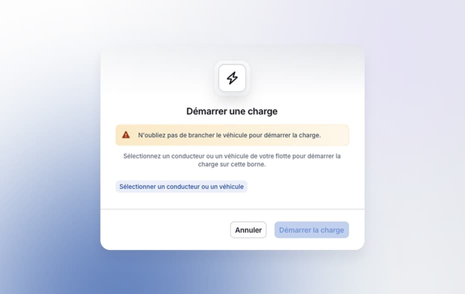 Étape 1 — Lancer l'action : cliquer sur Démarrer une charge depuis le panneau de détail d'un point de charge. Une fenêtre de confirmation s'ouvre.